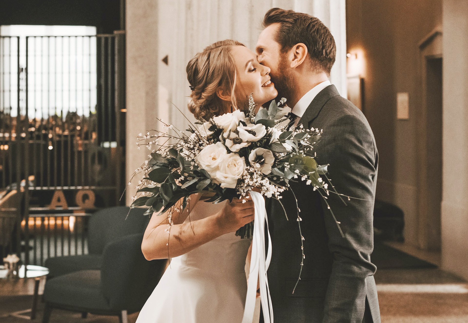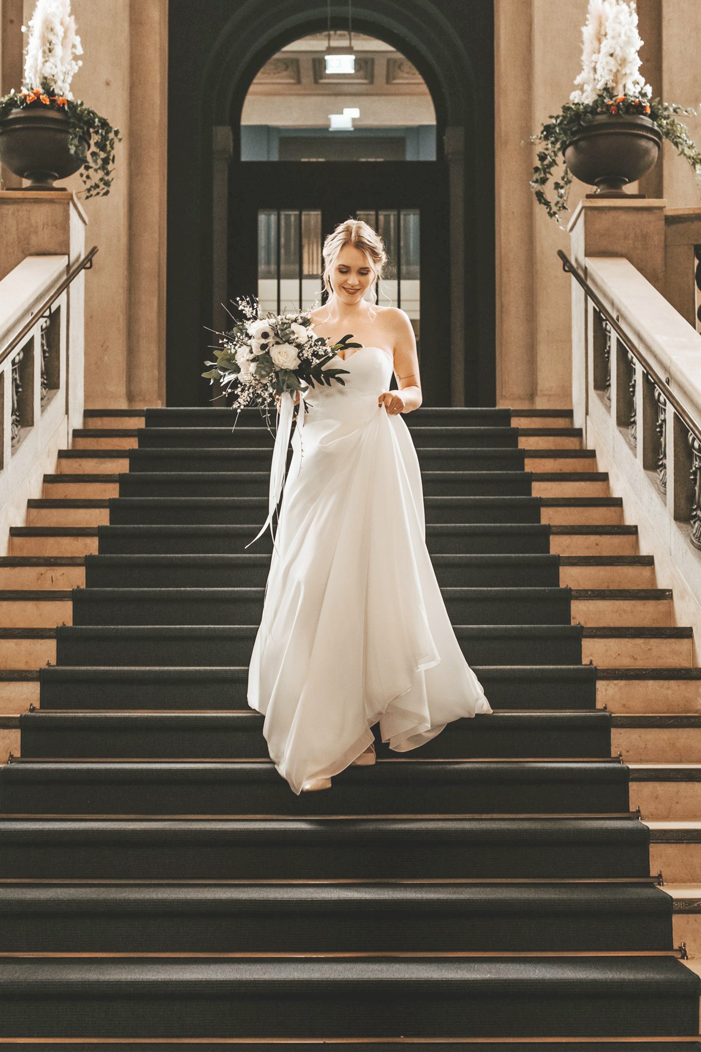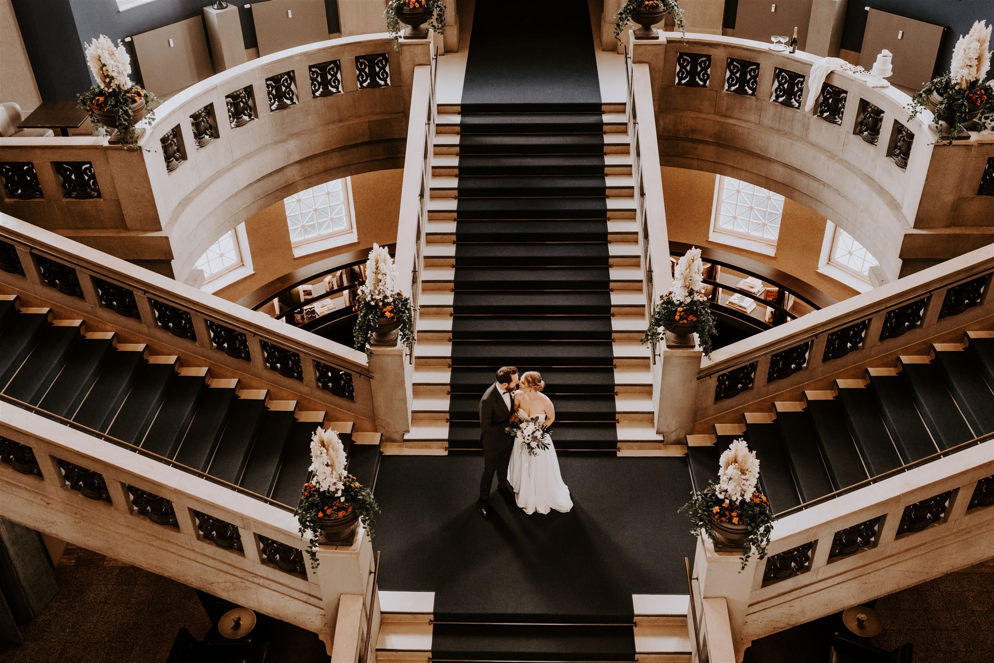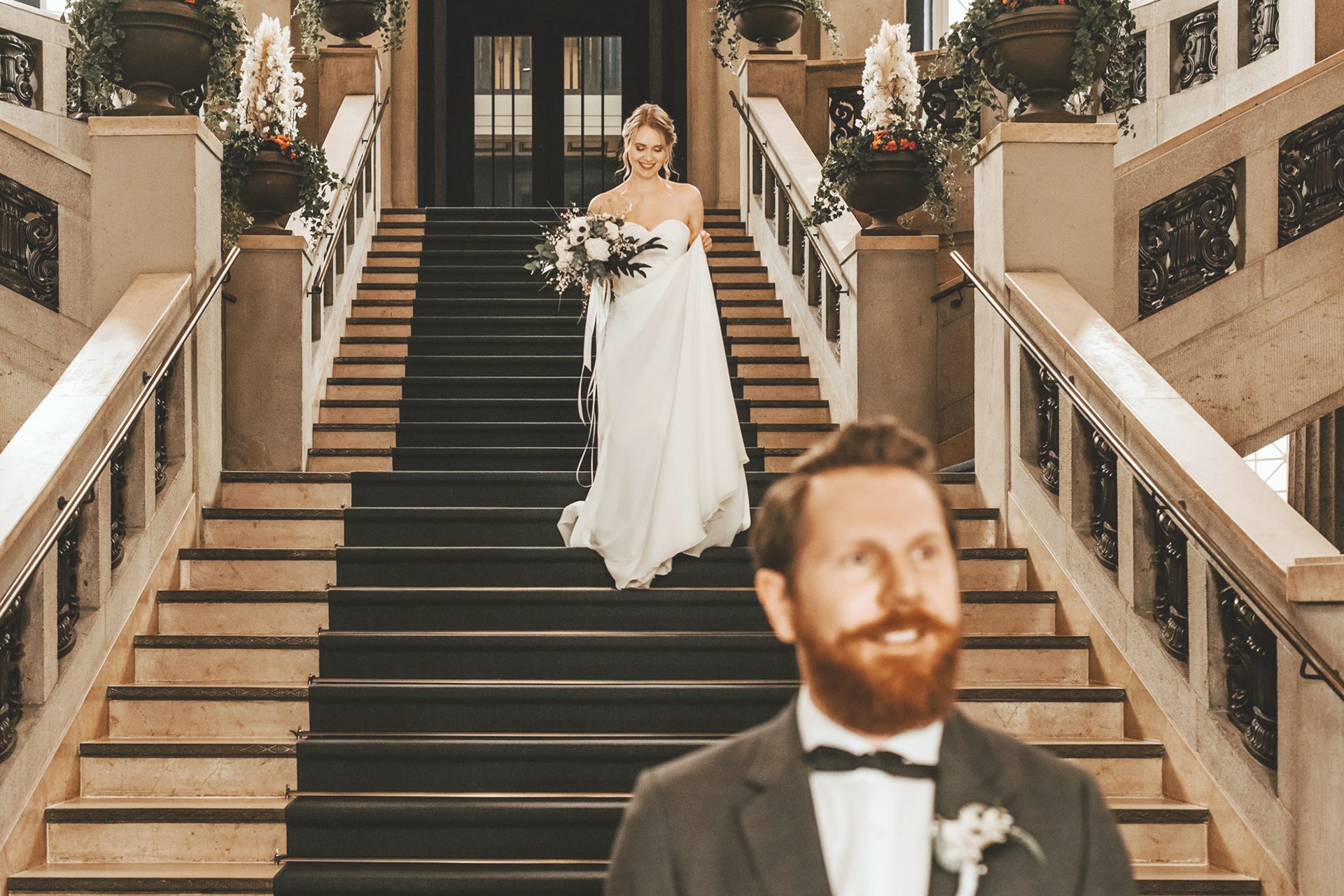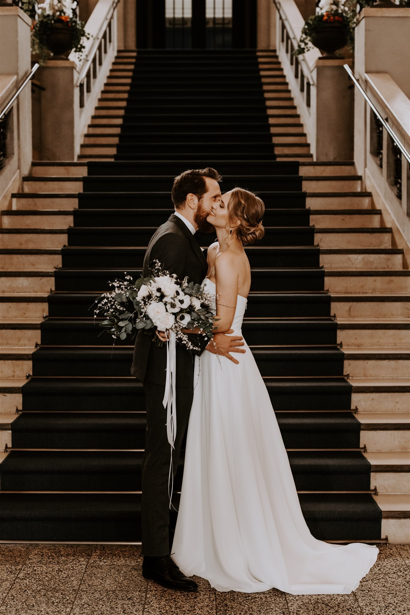 The lobby with its stately staircase and many other impressive areas, such as the imposing entrance portal, are perfect as a backdrop and stage for photos of the bridal couple and the wedding party.