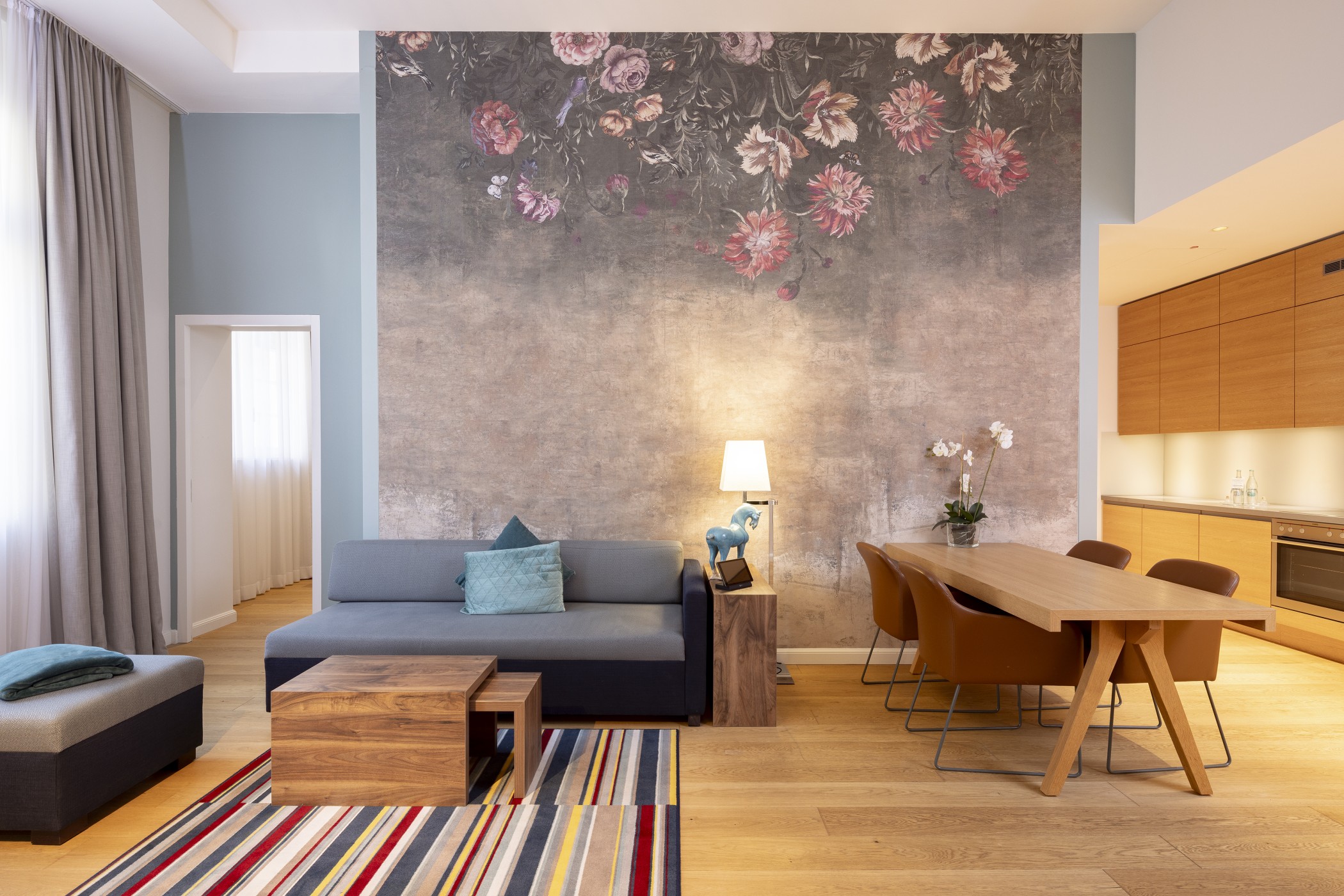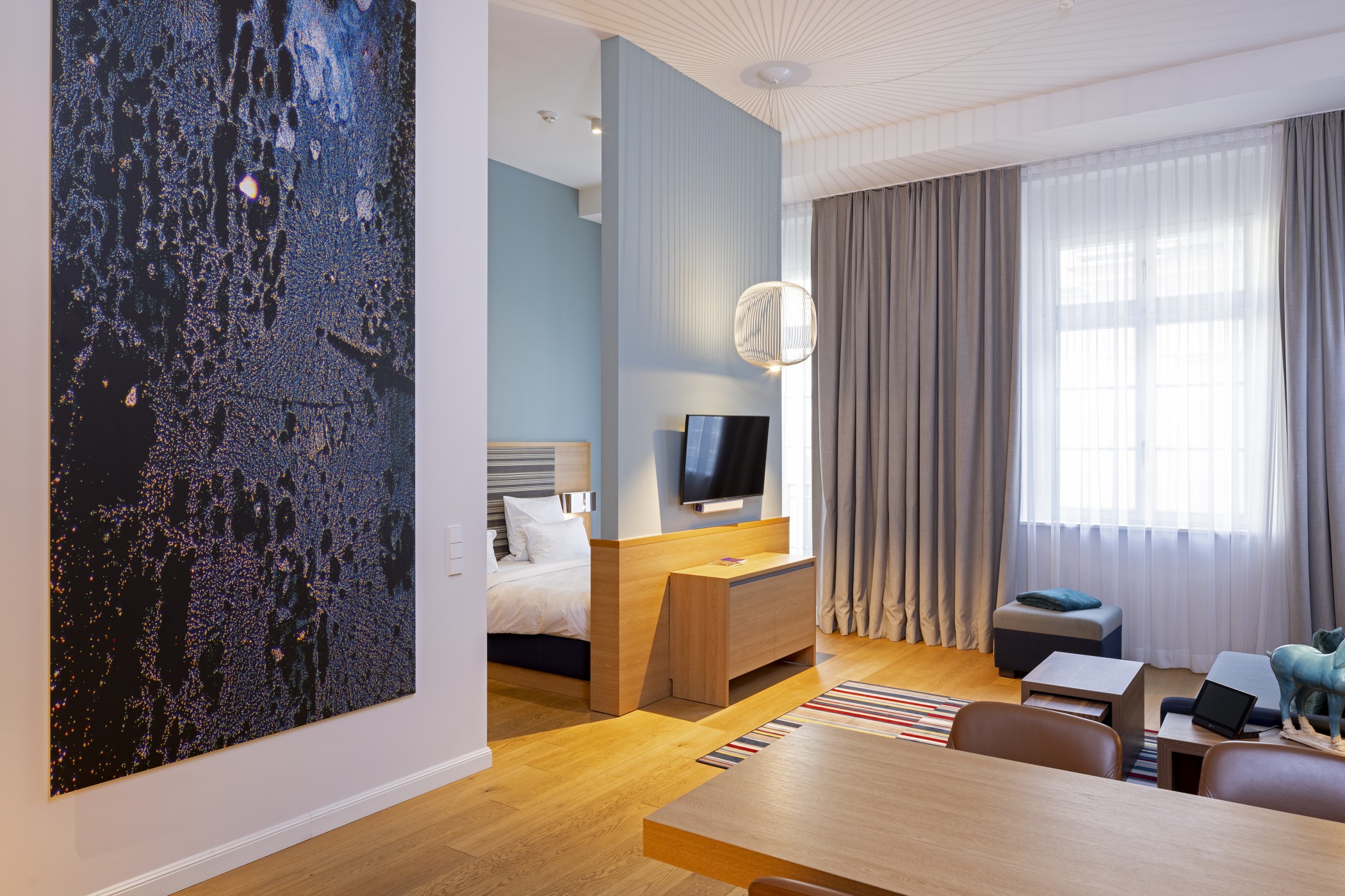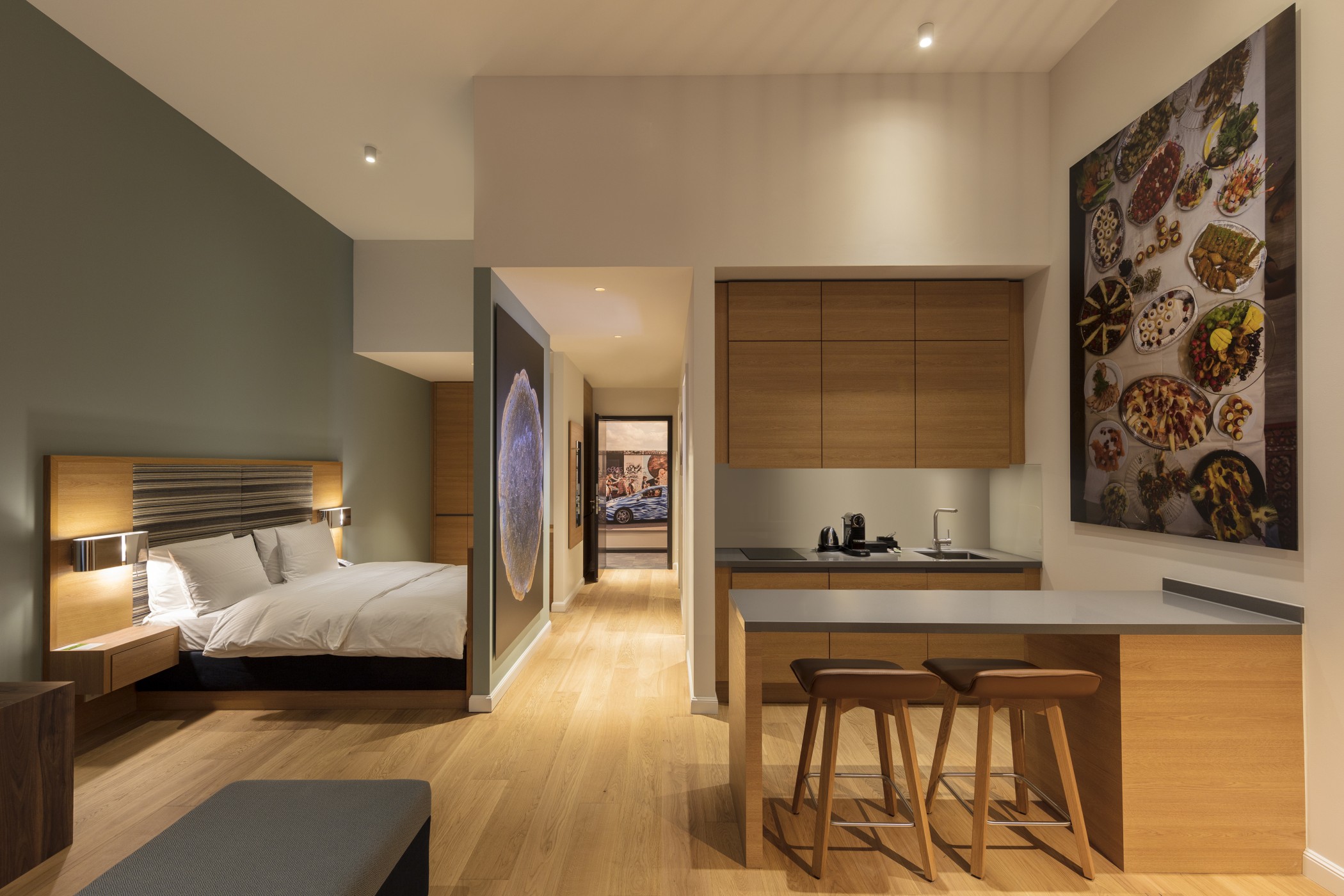 Für den Städtekurzurlaub bis zum längeren Aufenthalt von bis zu sechs Monaten aus privaten oder beruflichen Gründen – die Studios können viele Funktionen übernehmen. Auf 35 Quadratmetern findet man hier ein Schlafbereich samt Kingsize-Bett und einen Wohnbereich mit Küchenzeile. Die mit 4 Metern sehr hohen Decken, die Farbgestaltung und das Kunstkonzept verleihen den Studios eine besondere Leichtigkeit.