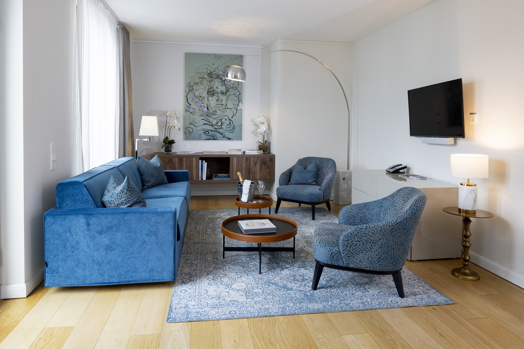 Mit einer Fläche von 46 bis 69 Quadratmetern gehören die Studio Suiten eher zu den kompakten ihrer Art. Doch die Deckenhöhe von vier Metern verleiht ihnen eine beeindruckende Großzügigkeit. Für den Komfort ist mit Kingsize-Bett und Sofa ebenso gesorgt, wie für die Funktionalität mit einem Arbeitsbereich. Die Wände zieren Originale des Künstlers HA Schult und verleihen der Suite eine individuelle Atmosphäre.