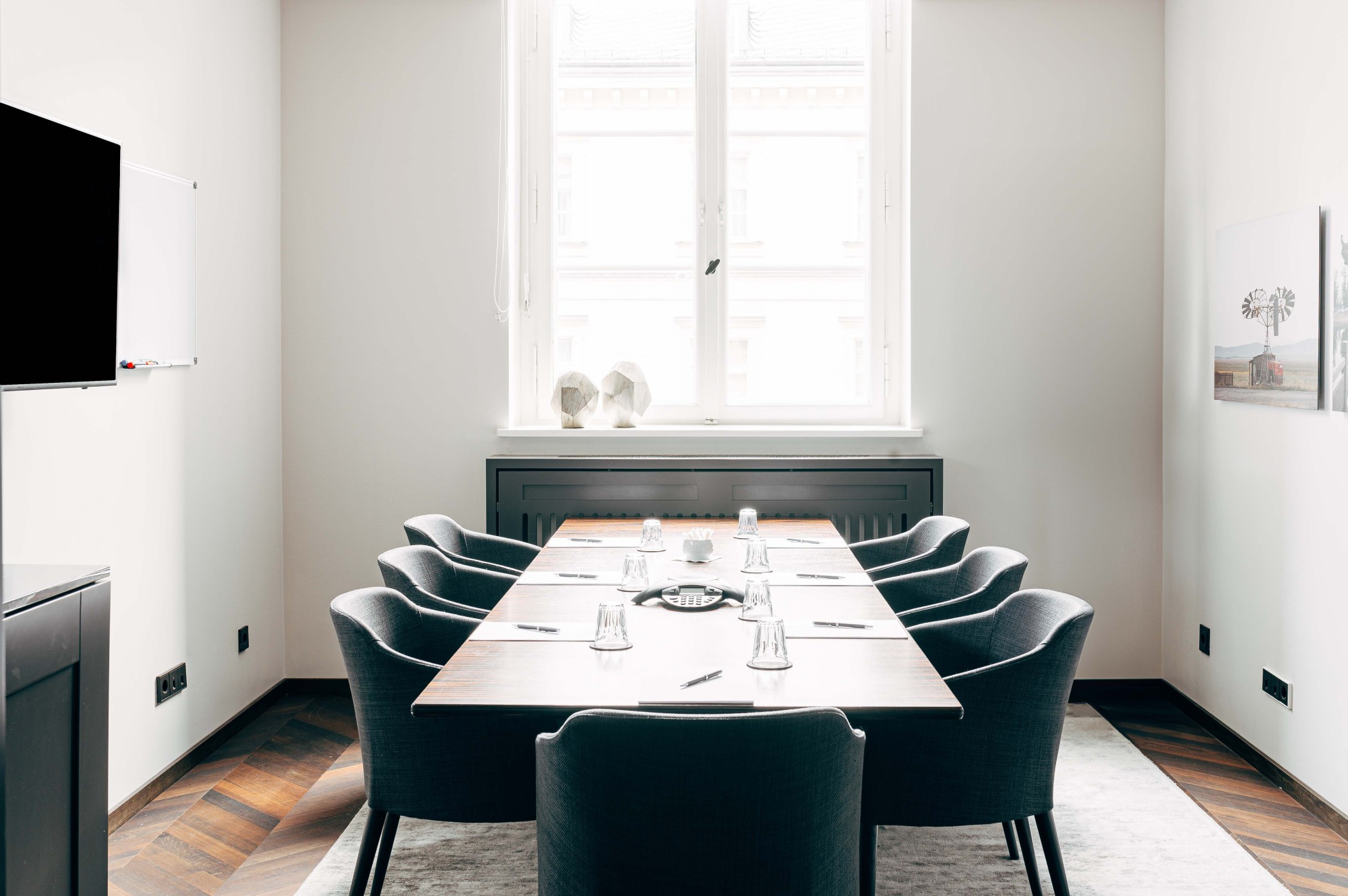 Im historischen Teil des Hauses befindet sich der Boardroom. Umfassend ausgestattet, bietet dieser Raum alles, was man für Verkaufspräsentationen, Projektbesprechungen und andere konzentrierte oder kreative Meetings im kleinen Kreis benötigt: HD-TV (45 Zoll), High-Speed WIFI für Videokonferenzen und Online-Recherchen, Whiteboard, Flipchart, Nespressomaschine und eigene Minibar.